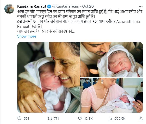 ક્વીન સ્ટારે શુક્રવારે તેના સોશિયલ મીડિયા હેન્ડલ પર હોસ્પિટલમાંથી તેના પરિવાર સાથેની ઘણી તસવીરો શેર કરી હતી. જ્યારે તેણીએ તેના ભત્રીજાને હાથમાં પકડ્યો ત્યારે તે ભાવુક બની ગઇ હતી. તેની માતા અને મોટી બહેન રંગોલી પણ બાળક સાથે રમતી જોવા મળી છે. પછી અભિનેત્રીએ ખુલાસો કર્યો કે પરિવારે નાના મહેમાનનું નામ અશ્વત્થામા રાણાવત રાખ્યું છે.